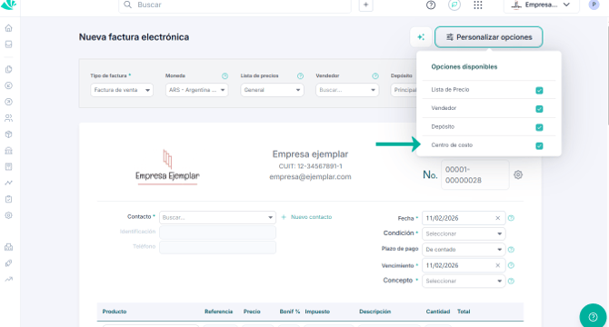📌 Nota: si no es visible el campo de "Centro de costo", hacé clic en Personalizar opciones y activá la opción correspondiente.