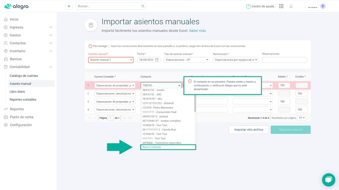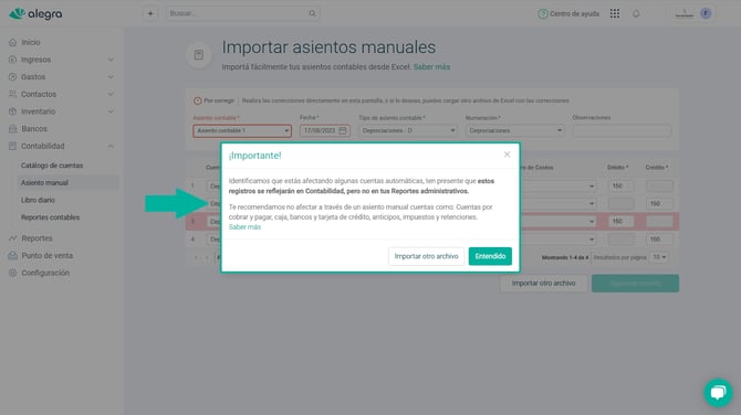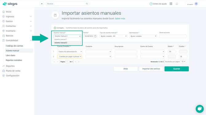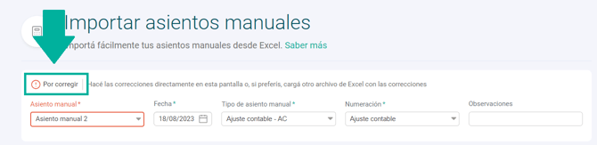 📍 Nota: no podés guardar los asientos contables importados hasta que hayas revisado todos los errores que se muestran en pantalla. - Podés visualizar los diferentes asientos manuales importados de forma más rápida desde la opción “Asiento manual”. Observá: