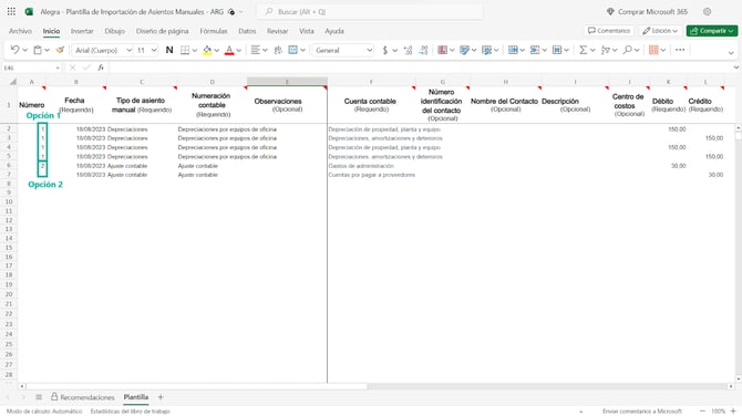 - Podés agregar información para importar uno o más asientos manuales. Para ello podés enumerar cada fila de la plantilla relacionada con un asiento manual usando el mismo número. Por ejemplo: El asiento No. 1 se identifica porque todas sus filas están marcadas con el número “1” o podés solo enumerar la primera fila correspondiente al asiento manual. Observá: