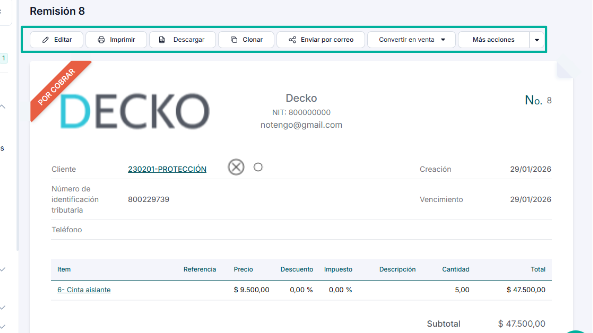 Luego de crear la remisión u orden de servicio, puedes editarla, imprimirla, enviarla por correo, anularla, convertirla a factura o adjuntar un archivo al documento 👇