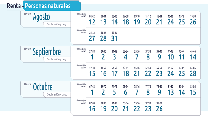 El período comprendido entre el 12 de agosto y el 26 de octubre del 2026 estipula los plazos límite para que las personas naturales efectúen la presentación de su tributo de renta.