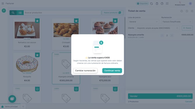 📍 Nota: Al superar los 400 €, TPV te mostrará una notificación para cambiar a factura ordinaria si lo deseas. Observa: