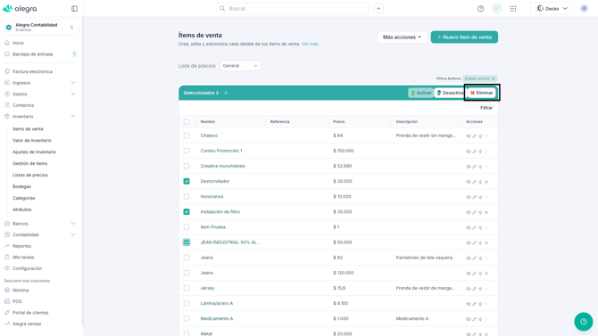 Si la opción de eliminar está desactivada, es porque el ítem tiene movimientos asociados.