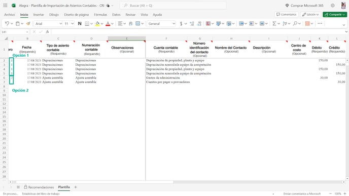 - Puedes agregar información para importar uno o más asientos contables. Para ello puedes enumerar cada fila de la plantilla relacionada con un asiento contable usando el mismo número. Por ejemplo: El asiento No. 1 se identifica porque todas sus filas están marcadas con el número “1” o puedes solo enumerar la primera fila correspondiente al asiento contable.