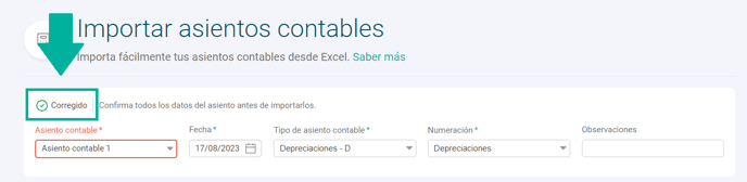 🔎 Descubre cuáles son y cómo funcionan las cuentas automáticas dentro del catálogo de cuentas. - Al momento de importar el asiento contable se mostrará un estado, cuando se deba corregir información se visualizará “Por corregir”, cuando esté corregida el estado será “Corregido” y finalmente si la información es correcta el estado es “Importado correctamente”.