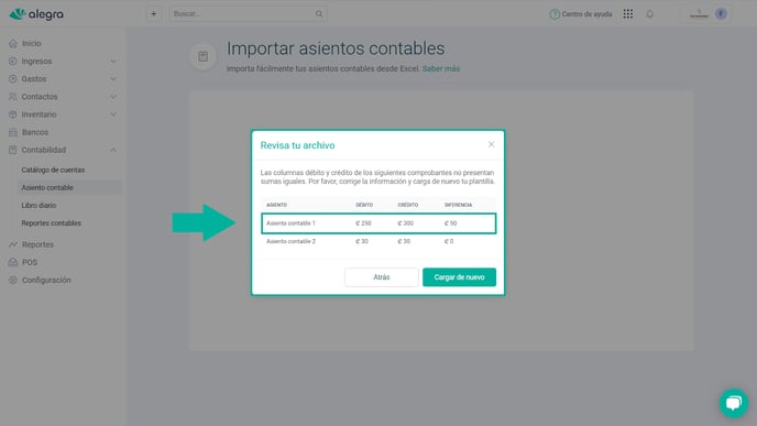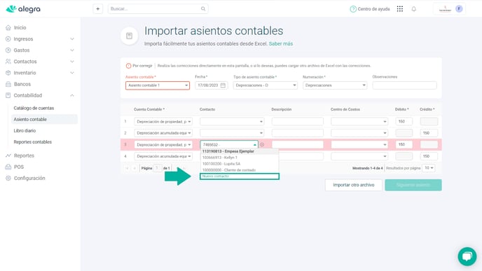 📍 Nota: no podrás guardar los asientos contables importados hasta que hayas revisado todos los errores que se muestran en pantalla. - Puedes visualizar los diferentes asientos contables importados de forma más rápida desde la opción “Asiento contable”.