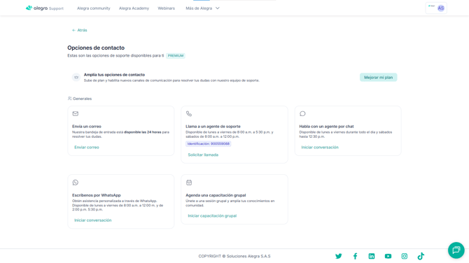 Los canales de soporte (como el chat o las llamadas) dependen del plan que tengas en Alegra. Te recomendamos revisar tu suscripción para ver qué opciones de contacto tienes disponibles según tu cuenta.🔍 Preguntas frecuentes al momento de pagar tu plan en Alegra.