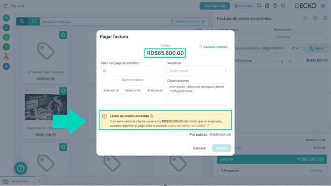 Al momento de facturar a crédito a nombre del cliente, y que esa venta supere el límite de crédito asignado, podrás visualizar una notificación informando que excedes el límite asignado, observa: