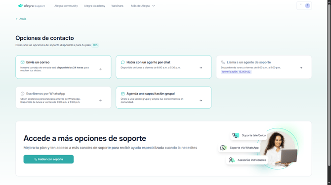 Alegra te brinda distintas opciones de apoyo diseñadas para adaptarse a tus horarios y necesidades específicas. Ya sea que prefieras resolver tus dudas de forma autónoma con herramientas inteligentes o requieras el acompañamiento de un experto, siempre habrá un canal disponible para ayudarte a ganar tiempo y tranquilidad.