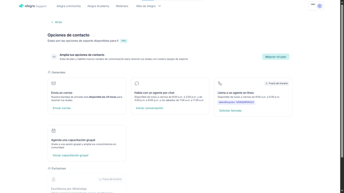Los canales de soporte (como el chat o las llamadas) dependen del plan que tengas en Alegra. Te recomendamos revisar tu suscripción para ver qué opciones de contacto tienes disponibles según tu cuenta.🔍 Preguntas frecuentes al momento de pagar tu plan en Alegra.