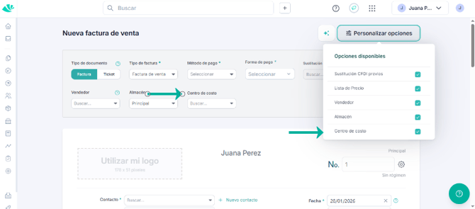 📌 Nota: si no es visible el campo de "Centro de costo", haz clic en Personalizar opciones y activa la opción correspondiente.
