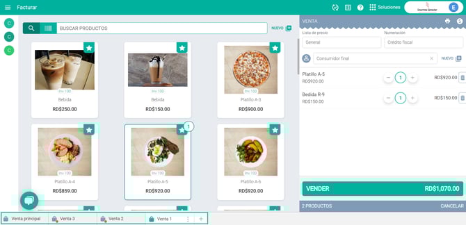 📢 Importante: Las ventas pendientes estarán ubicadas en la parte inferior de la pantalla identificadas con el Prefijo Ventas. Siempre tendrás una ventana fija llamada Venta principal que te permitirá generar nuevas ventas. Podrás generar todas las facturas adicionales y pendientes que desees.