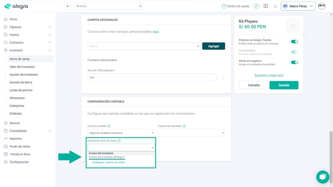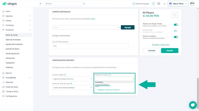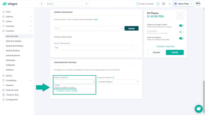 - Inventario (Activo no corriente): las cuentas contables con este uso podrás utilizarlas en la sección de contabilidad al momento de editar o crear los ítems de venta inventariables. Observa: