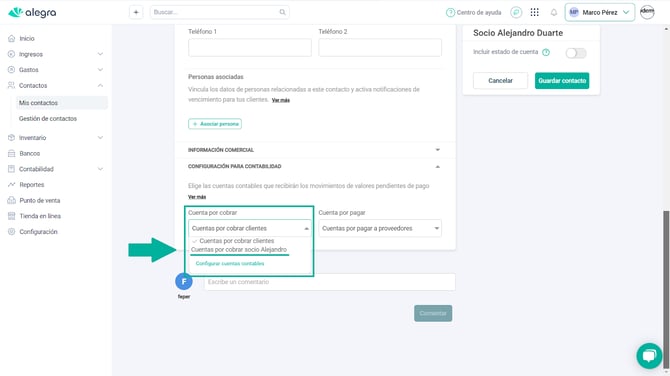 📍 Al eliminar el uso de "Bancos tipo tarjetas de crédito" de una cuenta contable previamente ajustada con esta propiedad, se borrará igualmente del módulo de bancos. - Cuentas por cobrar (Activo corriente): las cuentas con este uso estarán disponibles para asociar en la sección de configuración contabilidad al momento de crear o editar tus contactos. Observa:
