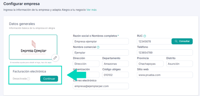 Configurar los datos de tu empresa en Alegra permite que todos tus documentos y reportes estén identificados con la información de tu negocio: razón social, RUC, dirección, logo y más. Desde el mismo formulario también puedes activar la facturación electrónica.